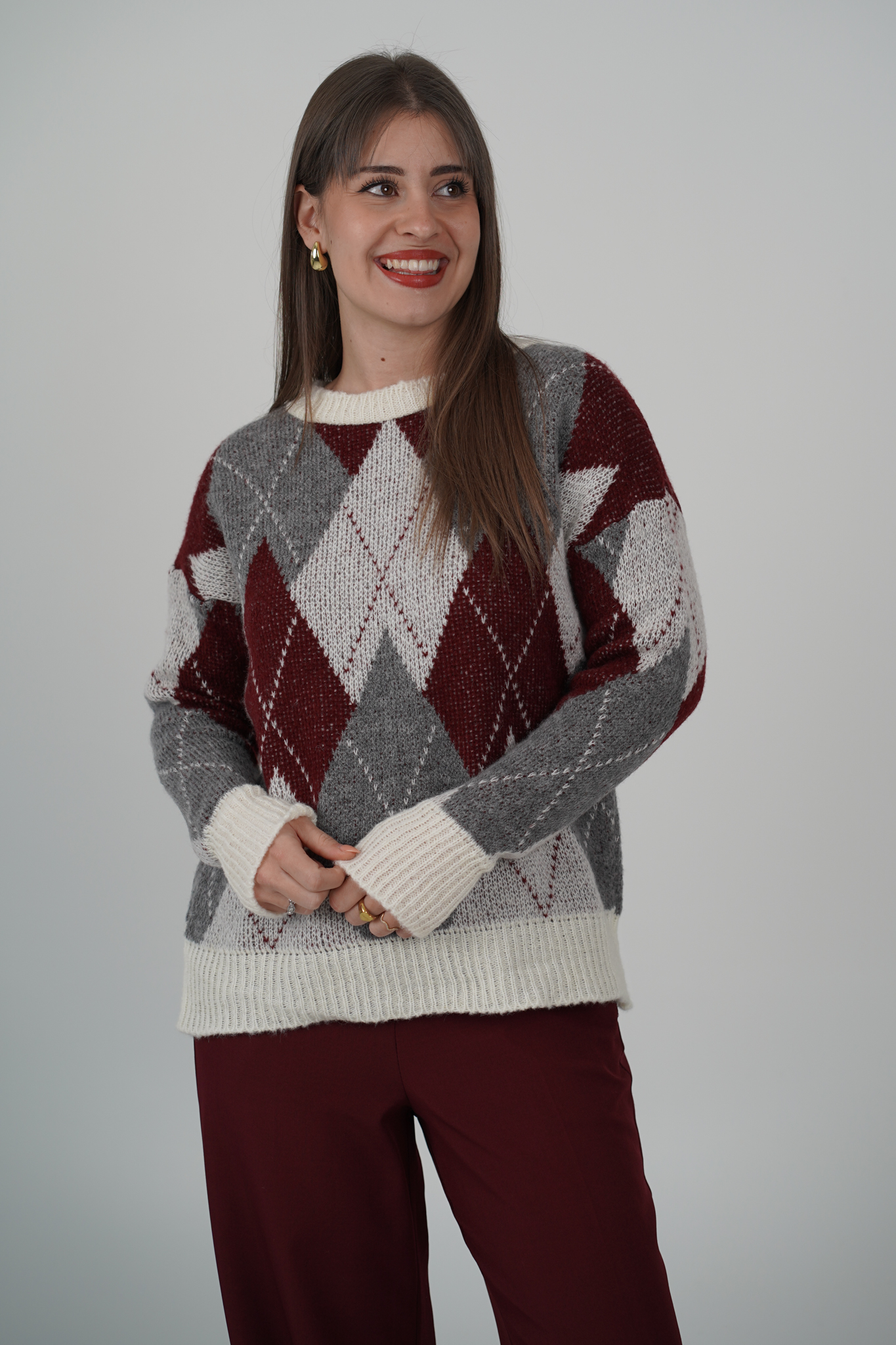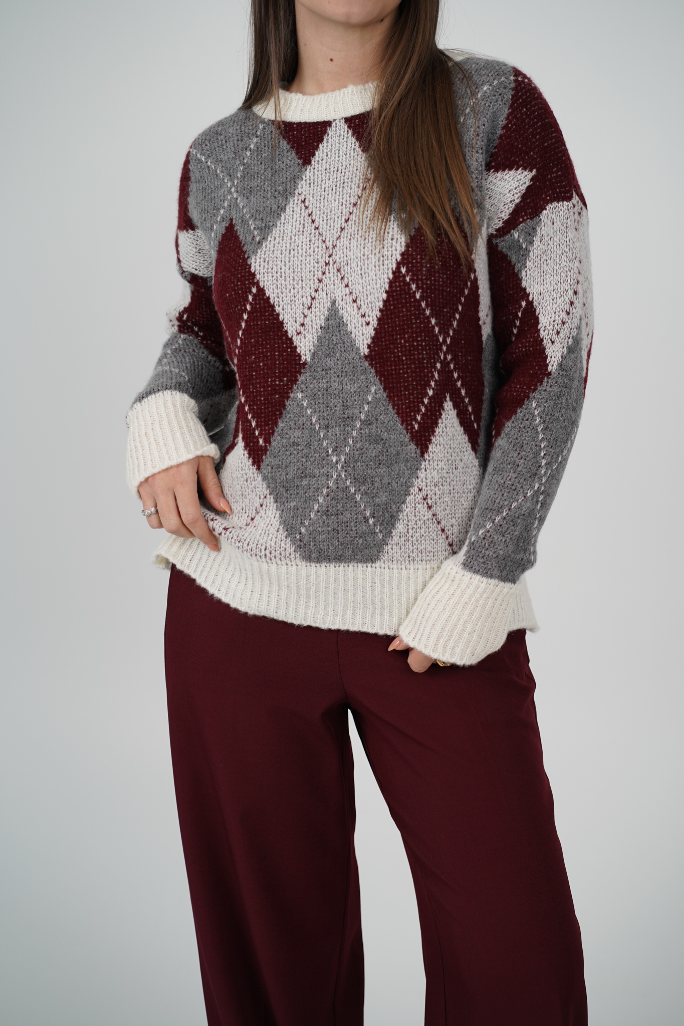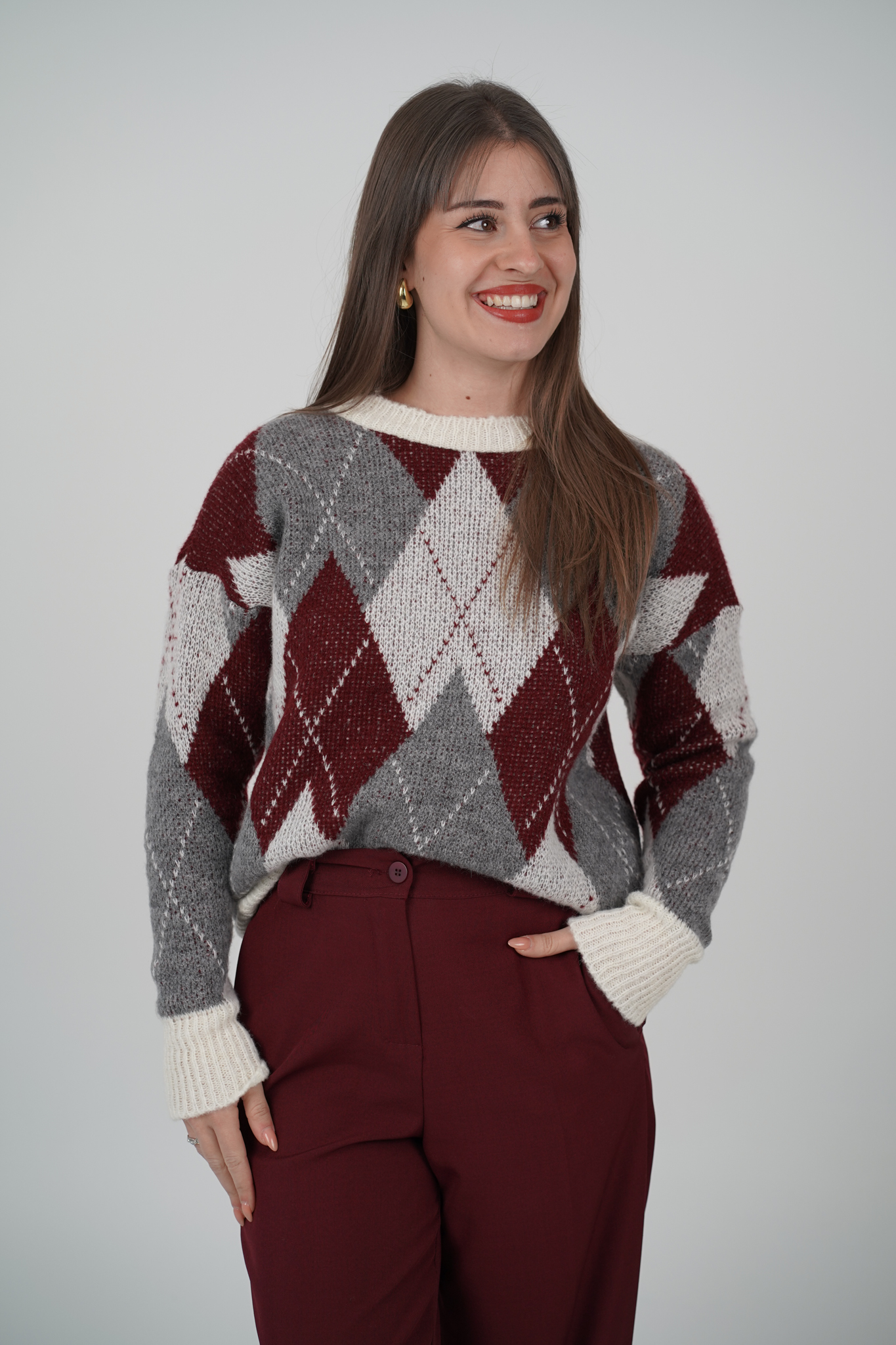 Descrizione: Questo maglioncino a scollo tondo con fantasia a rombi è il capo perfetto per chi ama distinguersi con stile. Il giromanica sceso regala una vestibilità morbida e rilassata, mentre il tessuto super caldo coccola la pelle come un abbraccio.
