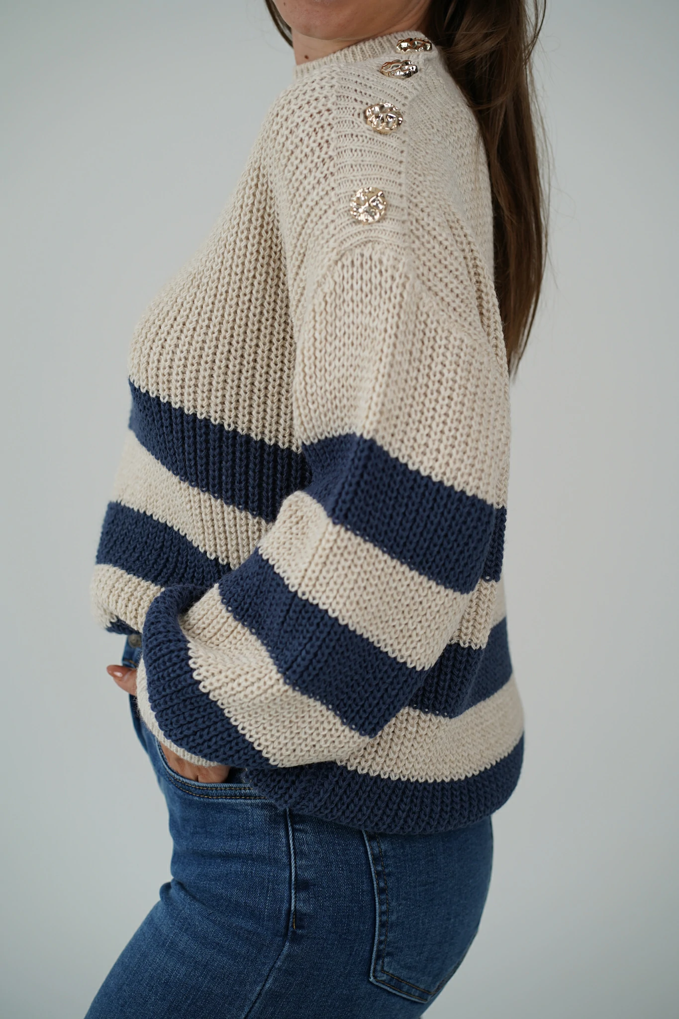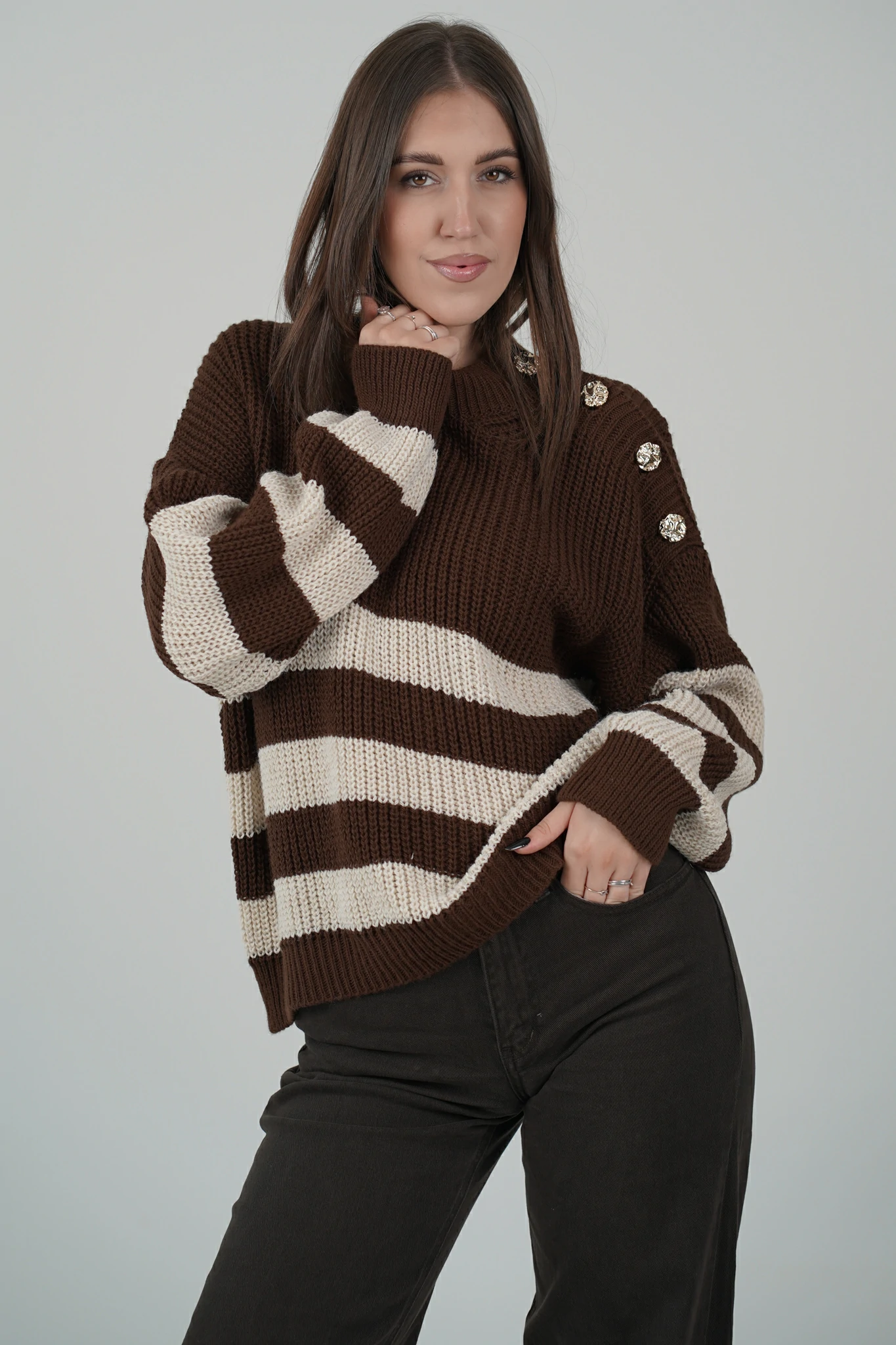 Descrizione: Ampio e morbidissimo maglione con bottoni gioiello sulla spalla e righe orizzontali – Lo amerai per il suo stile casual e chic ✨