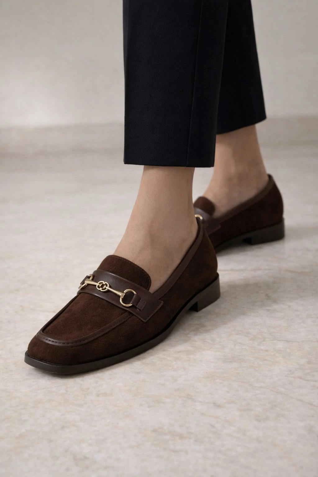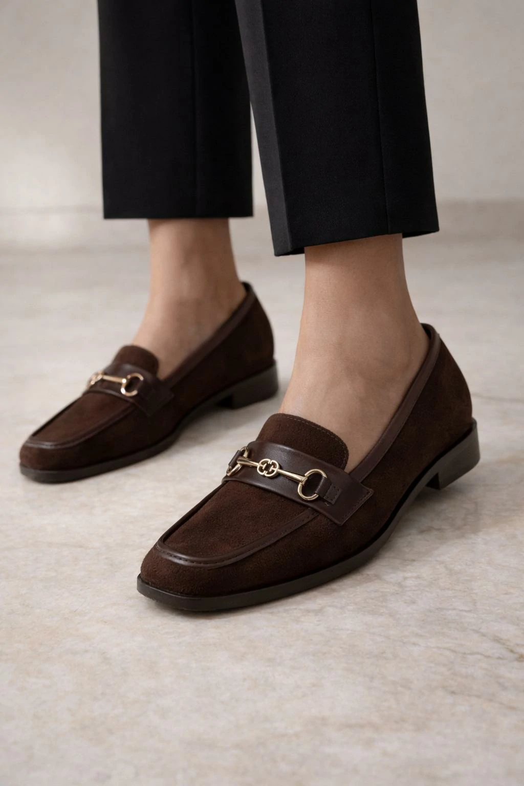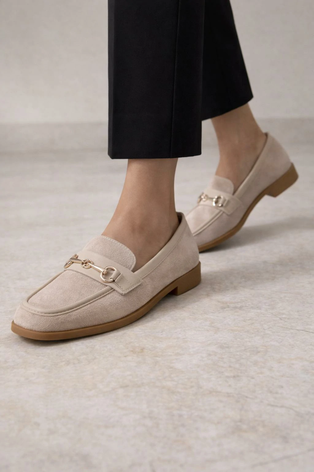 Con fibbia dorata, inserti in ecopelle tono su tono e suola in gomma