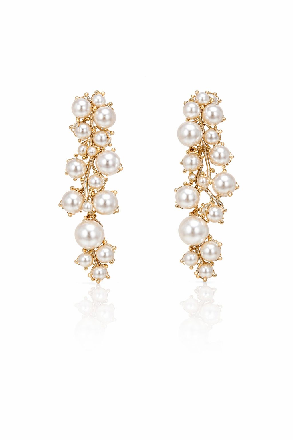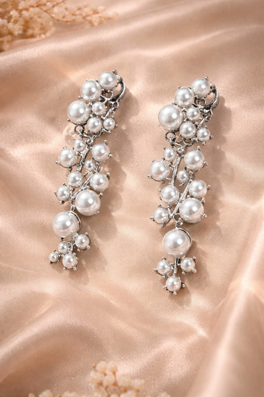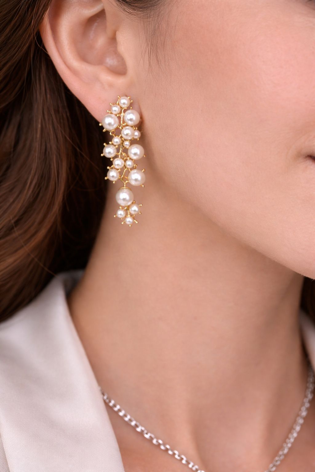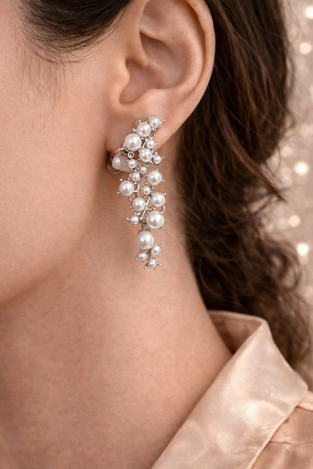 Orecchini pendenti dal design raffinato e scenografico, impreziositi da una cascata di perle luminose che creano un effetto elegante e sofisticato.