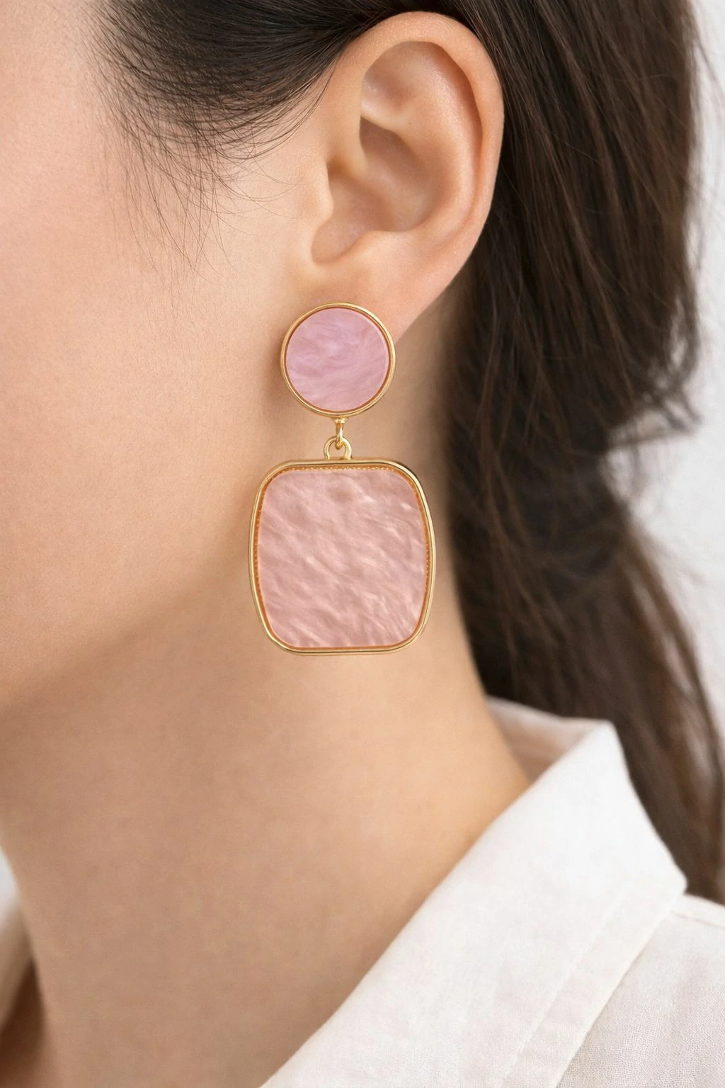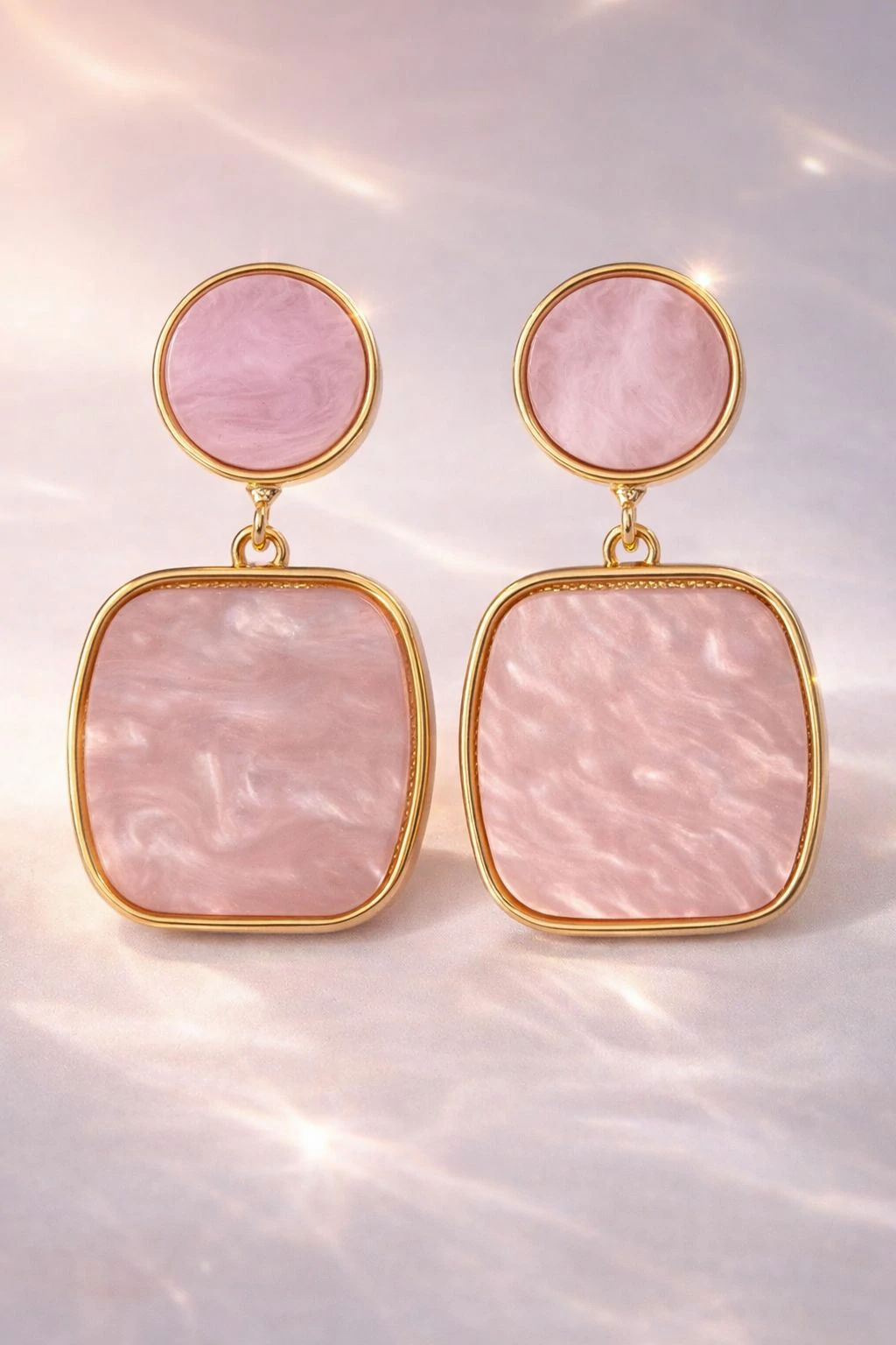 Orecchini pendenti dal design elegante e contemporaneo, caratterizzati da una doppia forma geometrica e da una raffinata pietra effetto marmorizzato rosa.