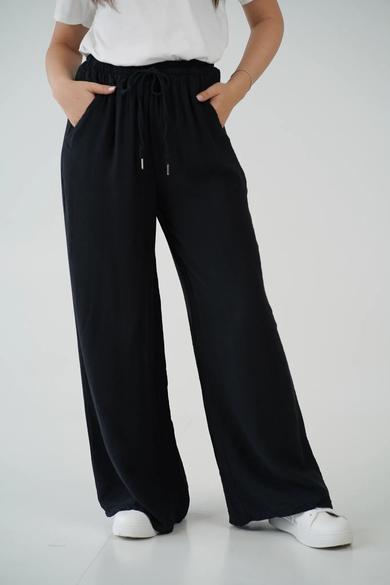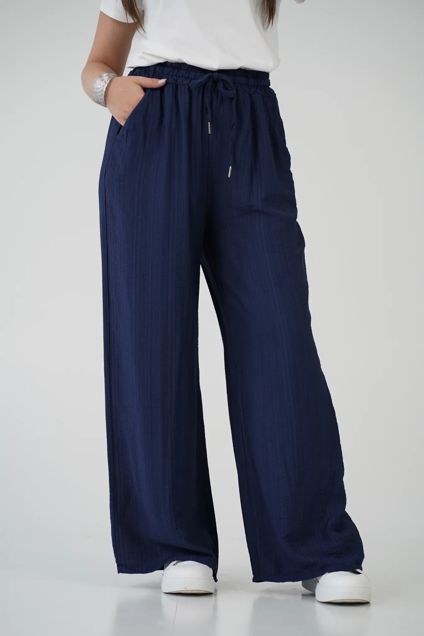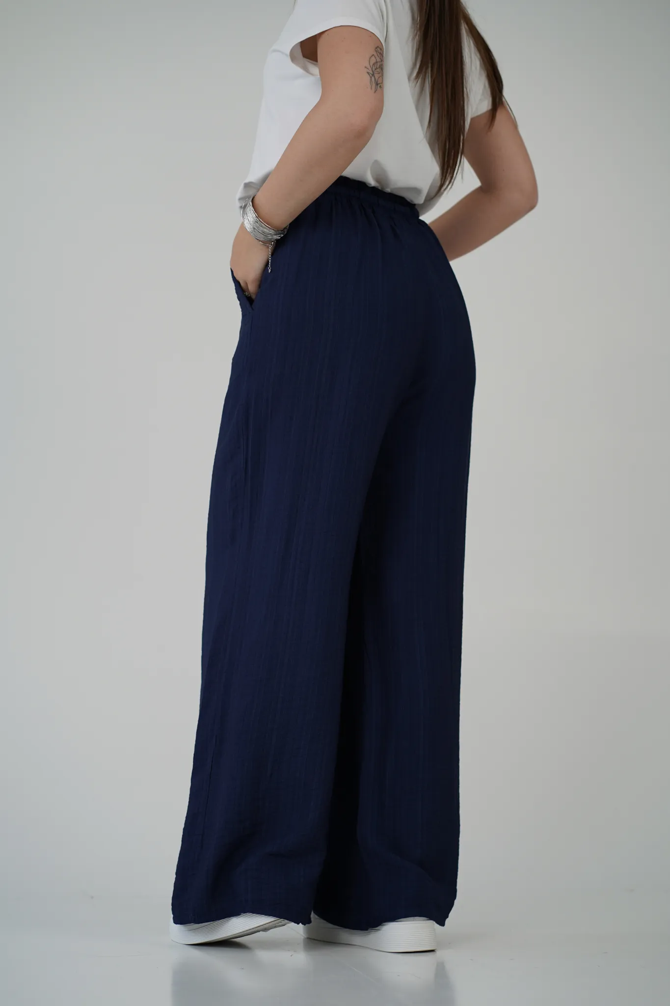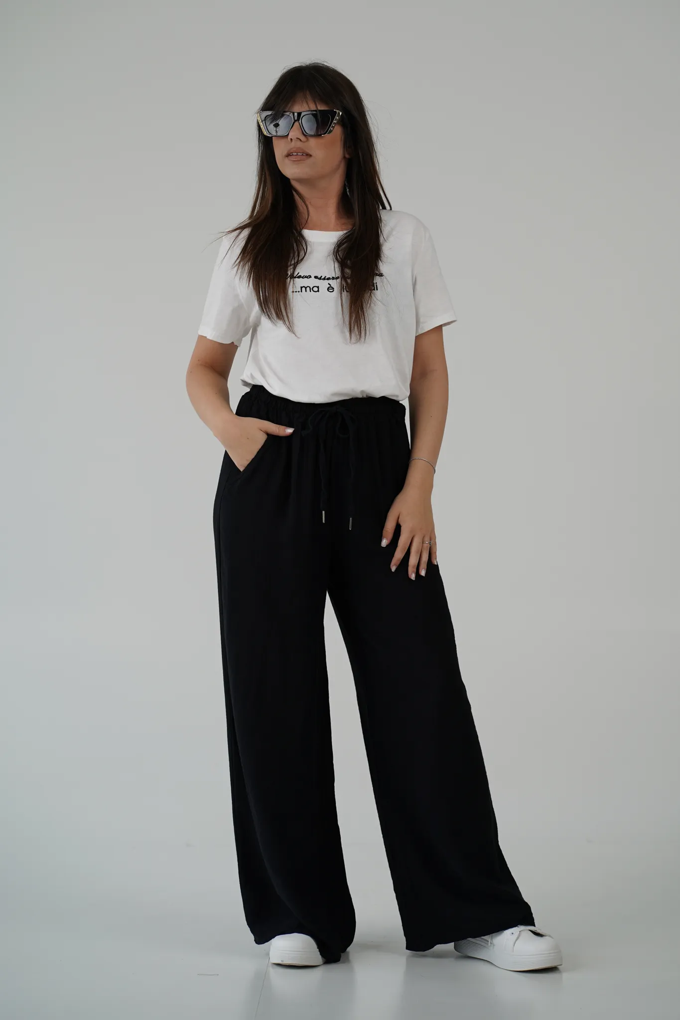 Descrizione: Pantalone palazzo in viscosa con elastico e laccetto in vita