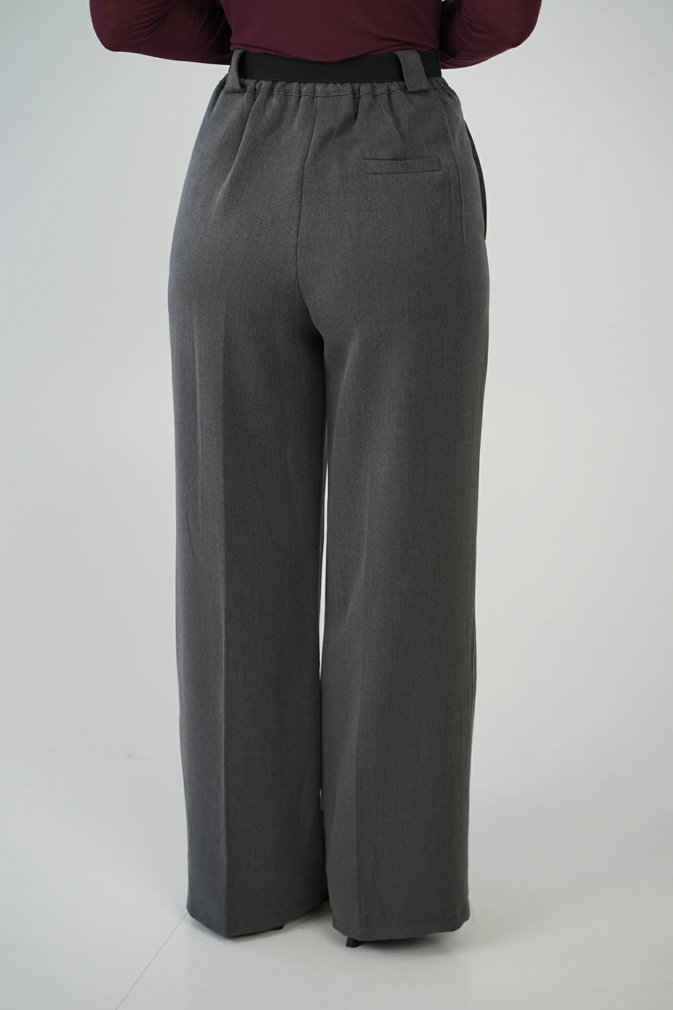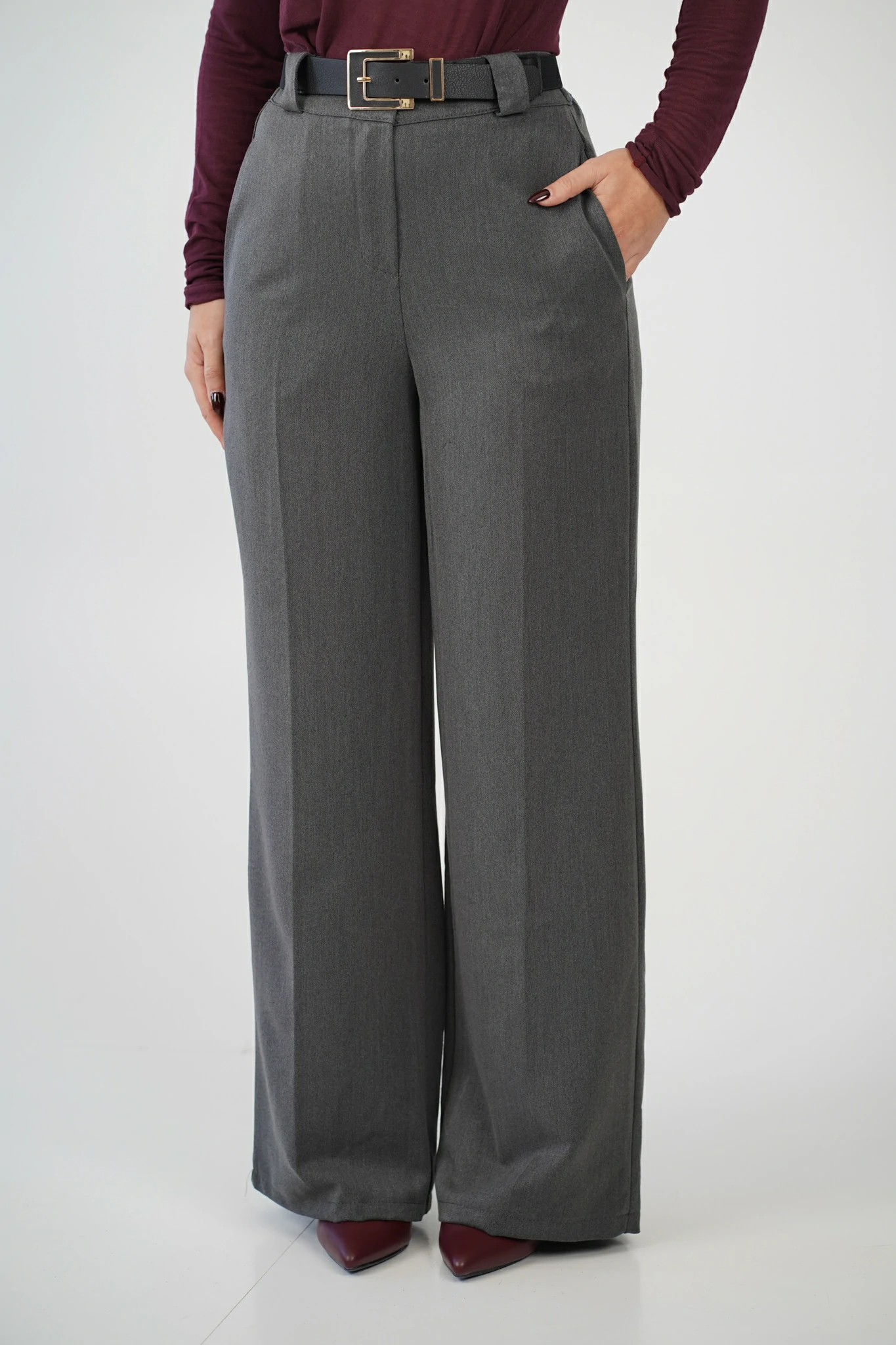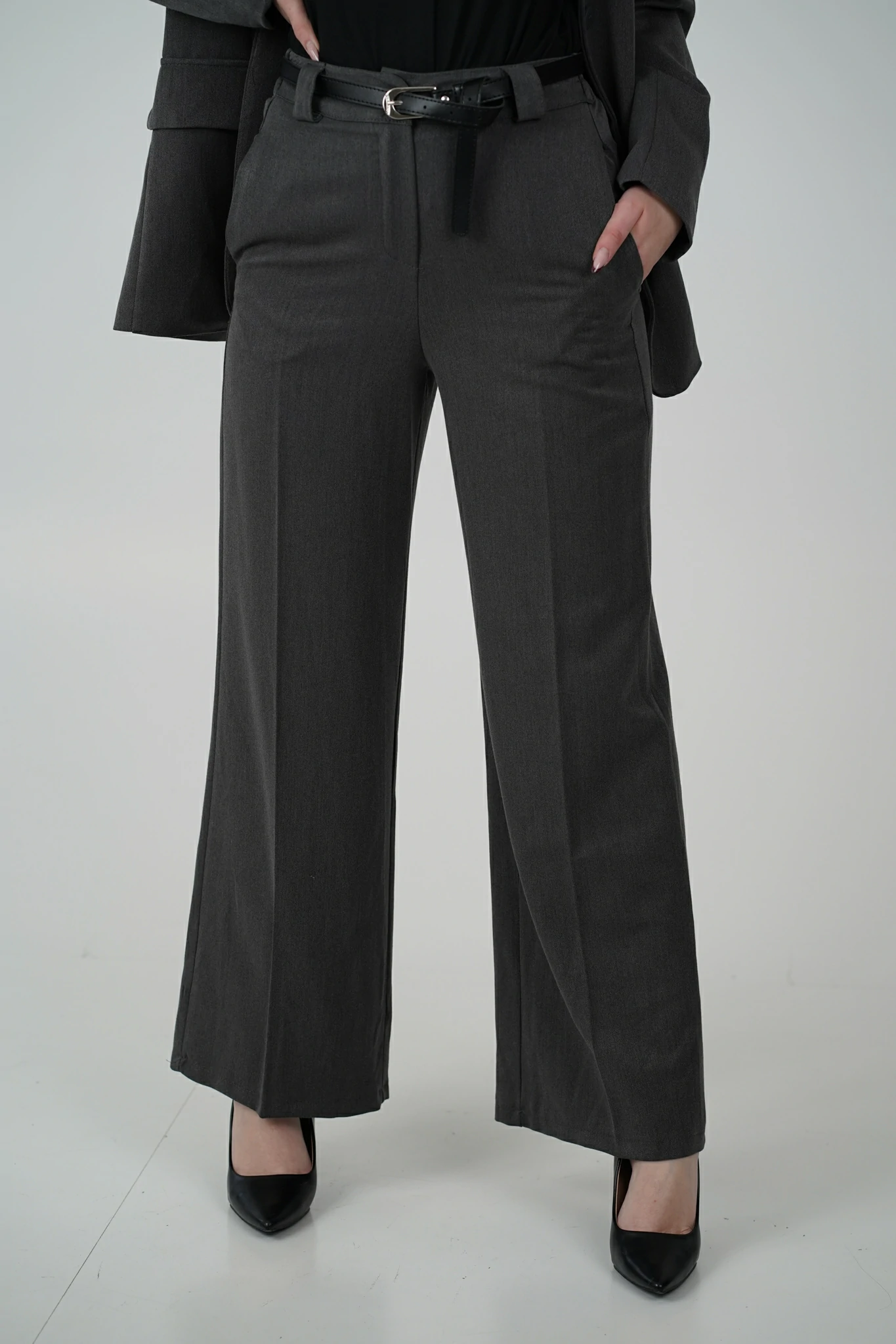 Modello con taschine inserite ai fianchi, passanti e cinturina, inclusa
