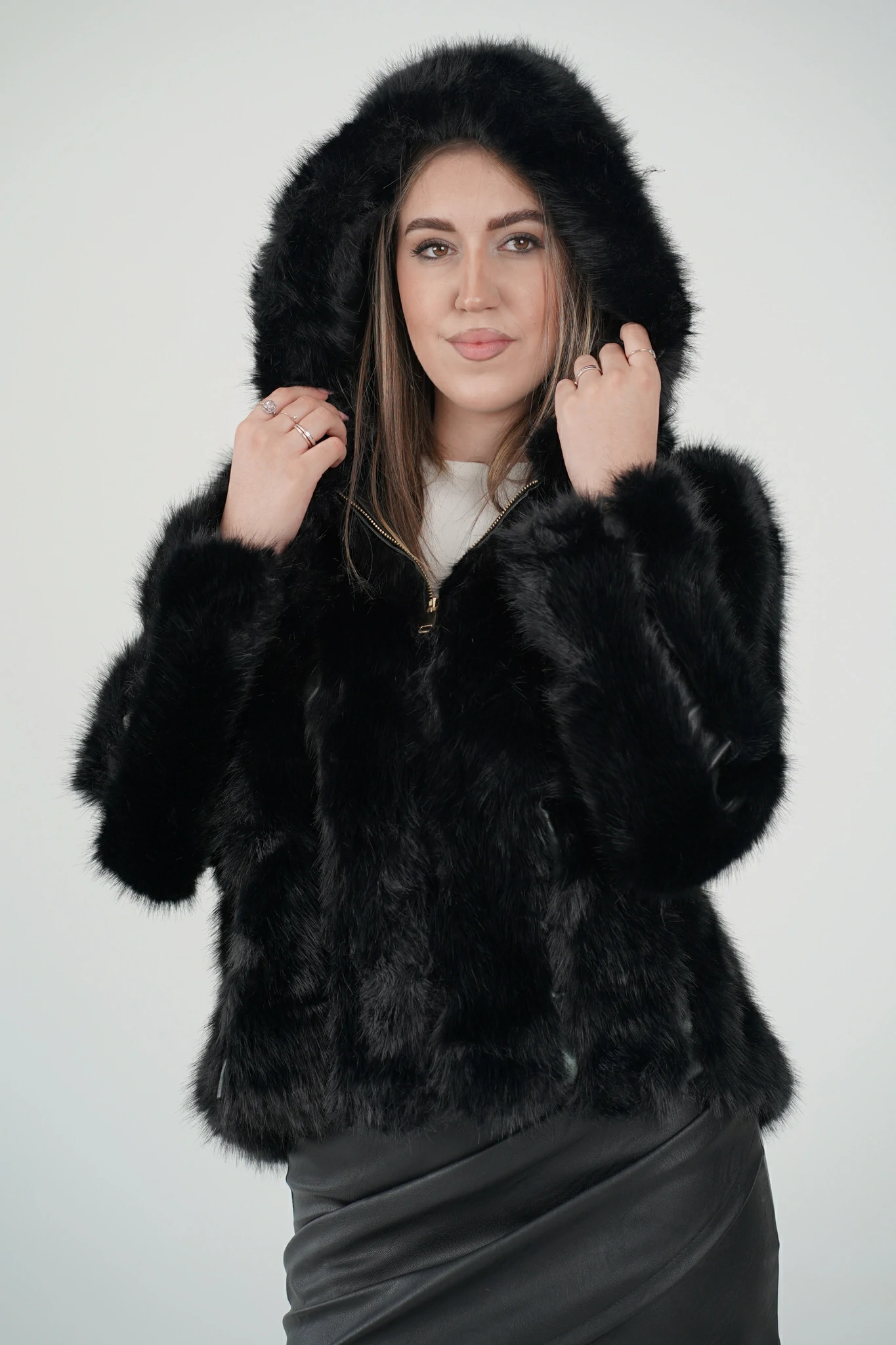 Descrizione: ✨ Pelliccia con Inserti in Ecopelle e Cappuccio
