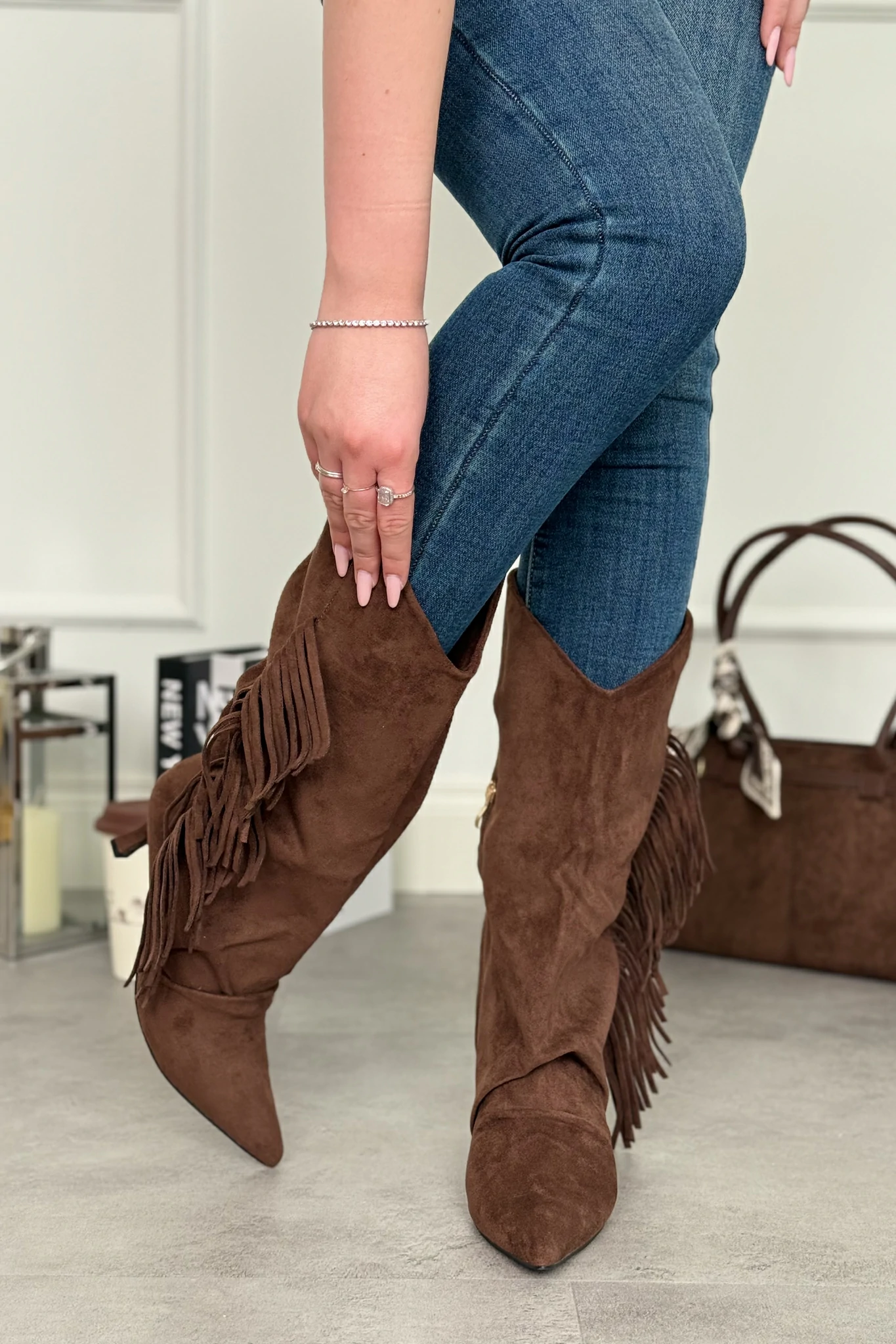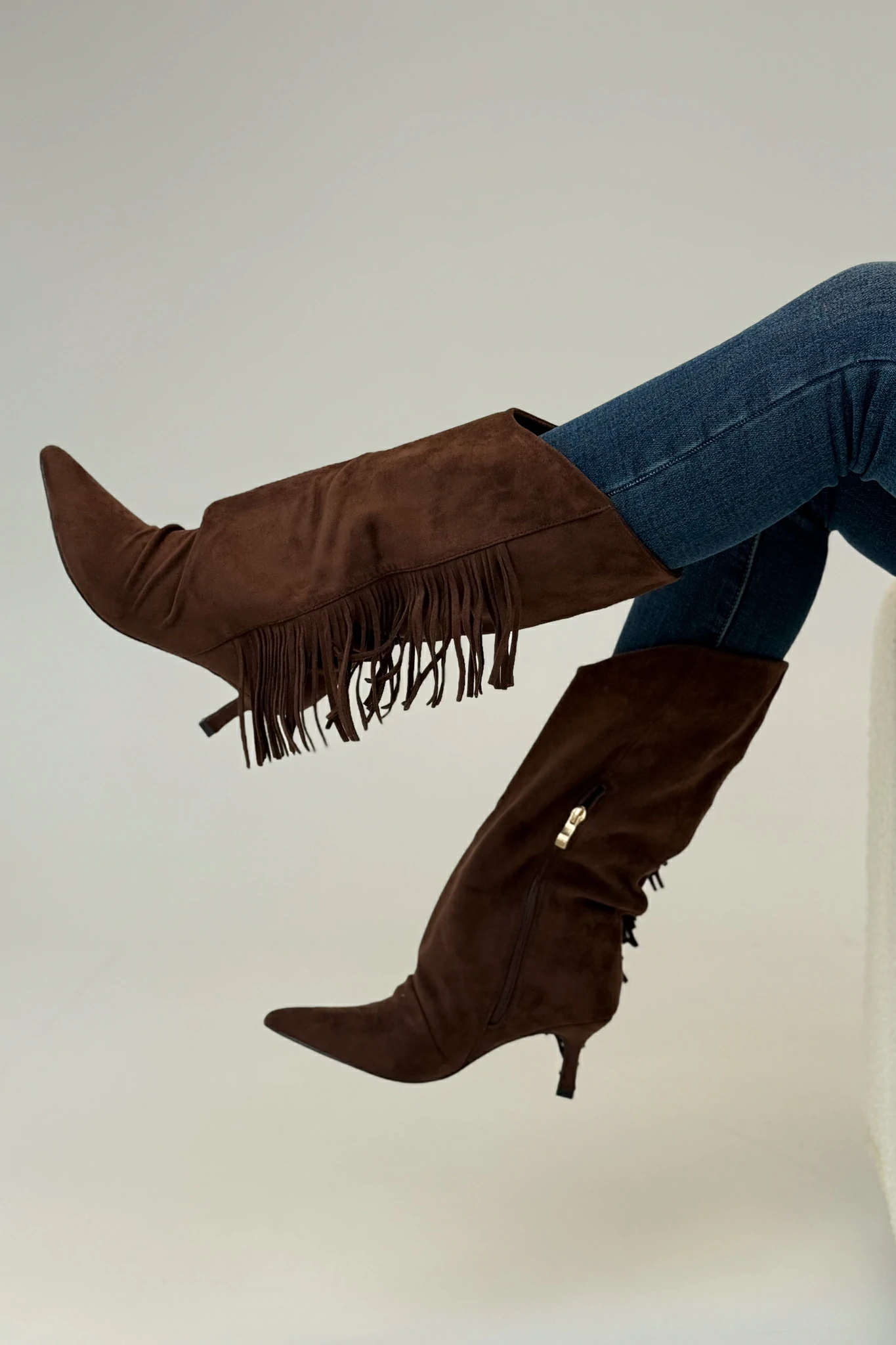 Dal fascino senza tempo, questo stivale in simil pelle scamosciata è il protagonista ideale dei tuoi look autunnali e invernali. La texture morbida si unisce a una silhouette pulita, impreziosita da frange laterali che donano movimento e carattere a ogni passo.