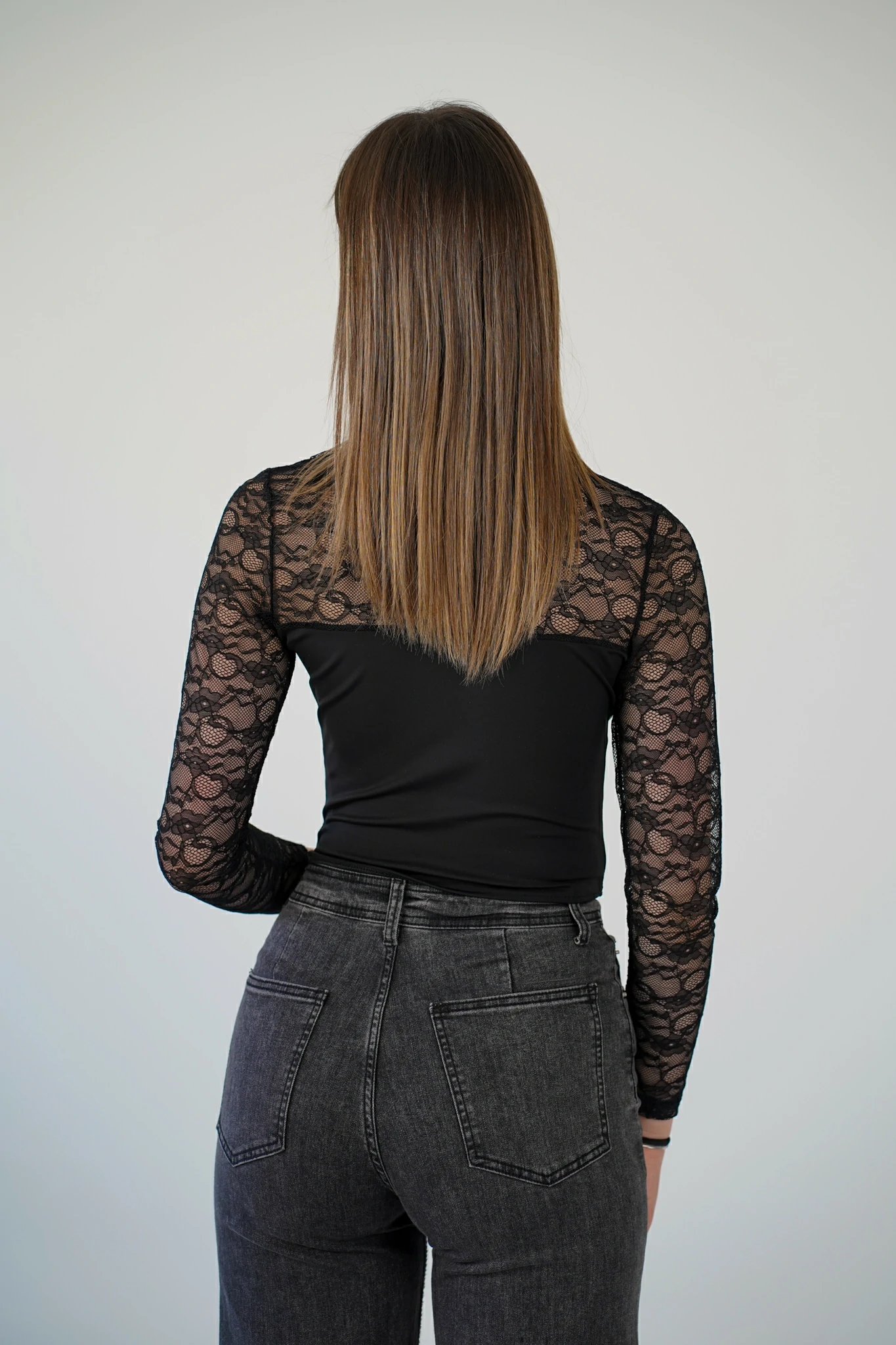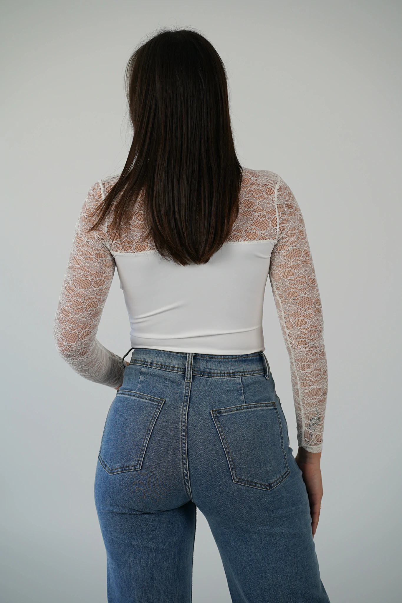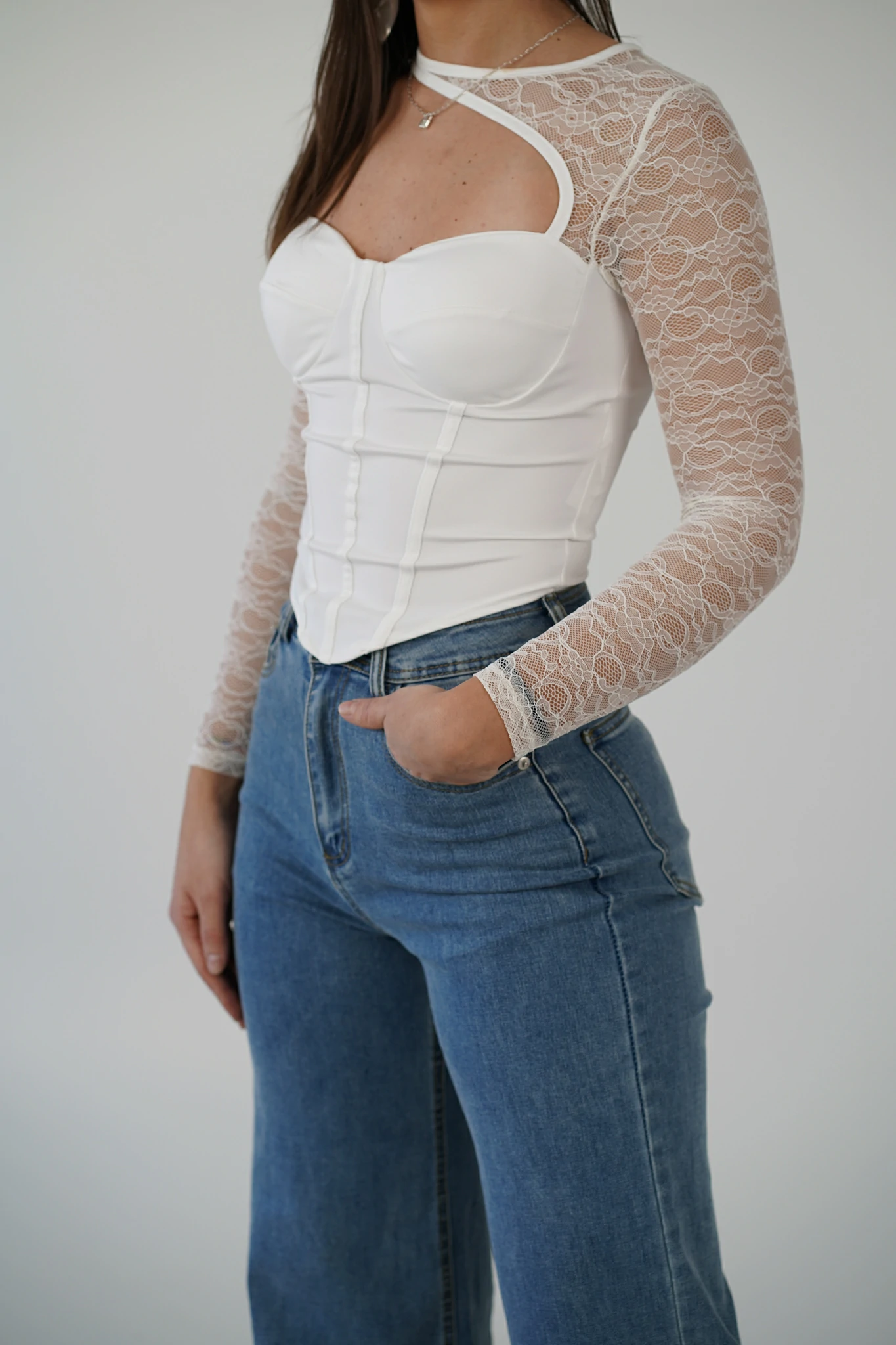 Questo top donna elegante in pizzo bianco è il capo perfetto per valorizzare la silhouette con classe. Il design con scollo asimmetrico e dettaglio cut-out crea un effetto sofisticato e moderno, mentre le maniche lunghe in pizzo donano leggerezza e femminilità.